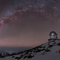 Landcape of the NOT and the Milky Way, composite of true-color and H-alpha pictures.